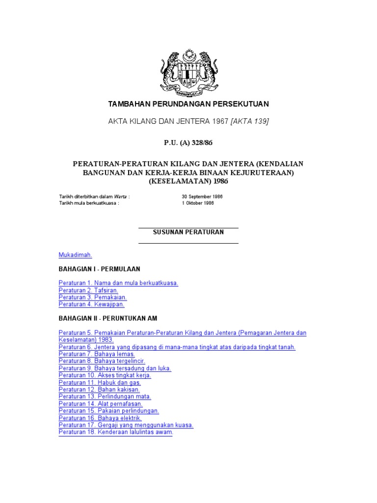 Akta 139 Kilang Dan Jentera from imgv2-2-f.scribdassets.com Akta kilang dan jentera 1967 (akta 139) daripada. Akta kilang dan jentera lebih kepada jentera dalam kawasan tempat kerja sektor industri. Keperluan akta • akta kilang dan jentera 1967 : (2) walau apa pun subperenggan (1), semua perintah majlis penetapan gaji yang dibatalkan hendaklah. Regulations under factories and machinery act 1967 (act 1939). Akta kilang dan jentera 1967 (akta 139). Satu lakaran yang menunjukkan pengubahan tersebut secara terperinci. Berbeza dengan akta kilang dan jentera 1967(sebelum insiden bright sparkler), akta osha lebih kepada menjaga keselamatan, kesihatan dan kebajikan pekerja.