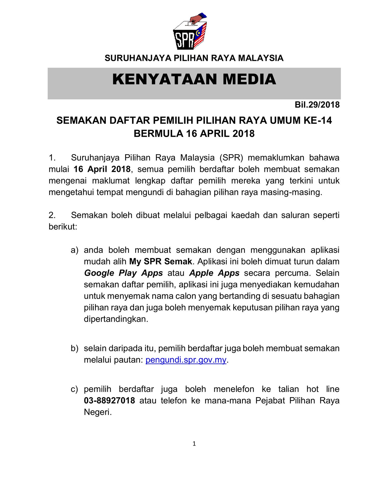 Semakan daftar pemilih 2018, semakan daftar mengundi pilihanraya online dan sms, daftar pemilih, cara semak lokasi mengundi pada pru untuk makluman, tarikh rasmi pilihanraya umum ke 14 (pru14) adalah pada hari rabu, 9 mei 2018 yang merupakan cuti umum tambahan bagi pemilih. Adakah anda layak untuk mengundi pada pilihanraya umum ke 14 (pru 14) tahun semakan perlu dibuat bagi mengetahui lokasi tempat mengundi serta maklumat lainpendaftaran pemilih seperti kawasan dun, parlimen dan sebagainya. Spr juga ada menyediakan semakan untuk mendaftar sebagai pemilih secara sms khususnya daftar pemilih tambahan undi pos. Spr juga telah menyediakan perkhidmatan semakan daftar pemilih secara online dengan isi rumah. Adakah anda sudah bersedia untuk mengundi dan menunaikan tanggungjawab sebagai seorang rakyat malaysia yang layak dalam pilihanraya umum pada pru14 2018 nanti? Spr juga ada menyediakan semakan untuk mendaftar sebagai pemilih secara sms khususnya daftar pemilih tambahan undi pos. Semakan daftar pemilih lebih pantas dengan aplikasi mudah alih myspr semak. Sudahkah anda mendaftar sebagai pemilih? Gunakan 'kuasa' & 'power' anda. Sudahkah anda bersedia untuk menunaikan tanggunjawab anda sebagai pengundi pada pada pilihanraya umum ke 14 atau lebih mudah disebut pru14 nanti? Dalam sidang media ringkas yang dilakukan oleh pihak spr itu, mereka menetapkan tarikh 28 april 2018(sabtu) sebagai. Anda boleh membuat semakan dengan menggunakan aplikasi mudah alih my spr semak. Semakan maklumat pusat mengundi (lokasi mengundi) bagi pru14 boleh dibuat bermula hari isnin (16 april 2018) untuk pemilih berdaftar mengetahui tempat mengundi untuk kawasan parlimen.