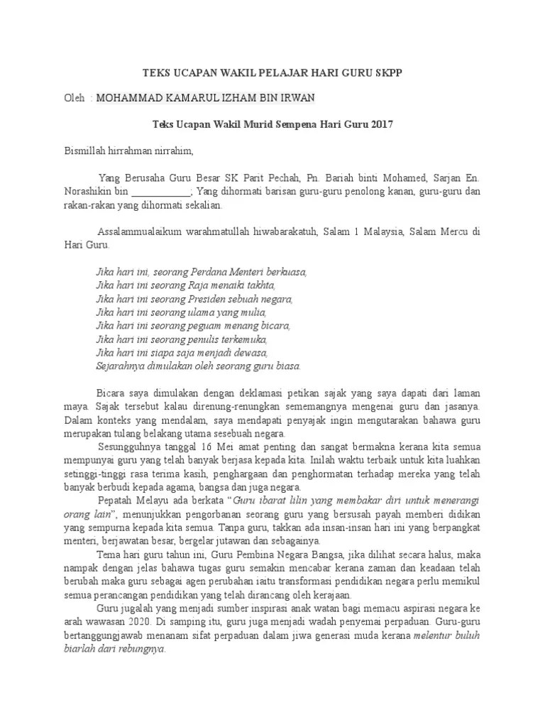 Persembahan murid/guru para guru dan rakan pelajar sekalian. Saya sebagai wakil murid, ingin mengucapkan selamat menyambut hari guru kepada semua guru di sekolah ini. Assalamualaikum w.r.b.t dan selamat pagi. Documents similar to contoh karangan ucapan murid sempena hari guru. Guru sentiasa mendidik kami supaya menjadi manusia yang berguna.